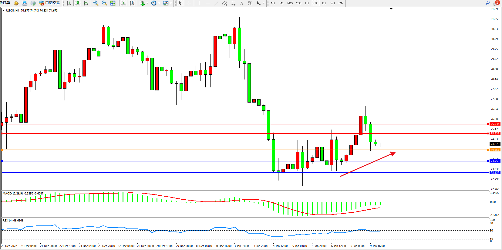 原油维持74.673附近震荡。全球最大原油进口国中国重新开放边境,提振了燃料需求增长的前景,并抵消了对全球经济衰退的担忧。但交易员重新评估寒冷天气对能源需求的影响,加上对更广泛全球市场衰退的担忧依然存在,料限制油价升幅。