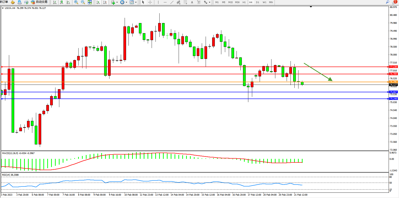 交易策略:76.296下方看跌,目标75.667、75.248
