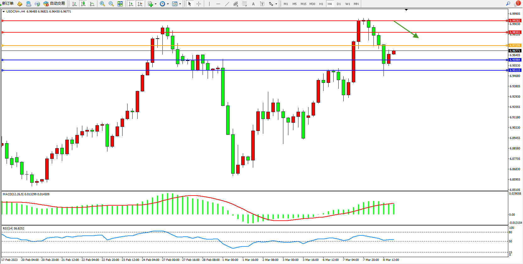 交易策略:6.97195下方看跌,目标6.95984  6.95115