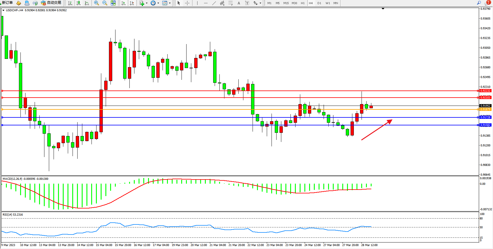 美元瑞郎USDCHF——4小时K线图显示: