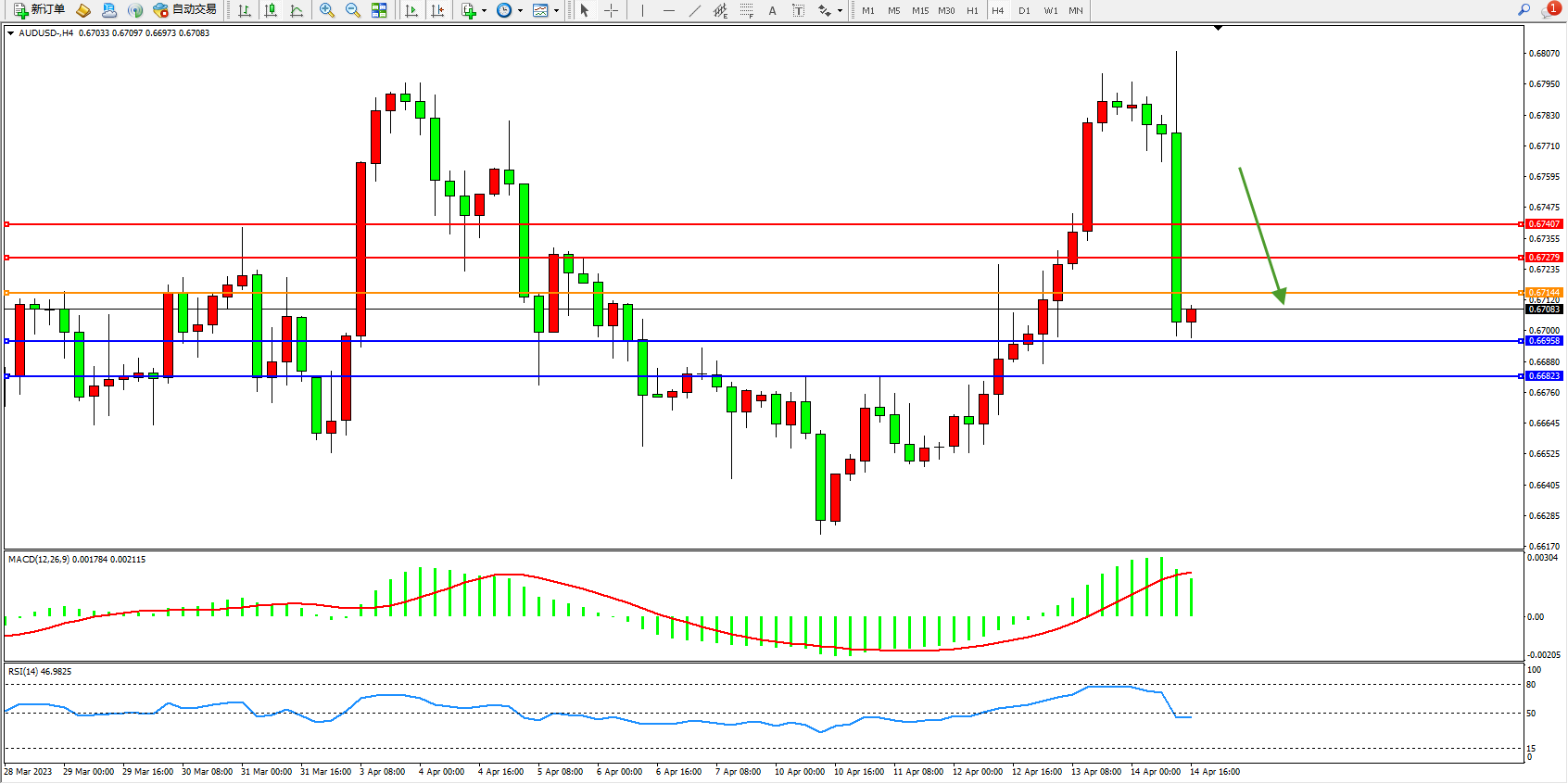 交易策略:0.67144下方看跌,目标0.66985  0.66823