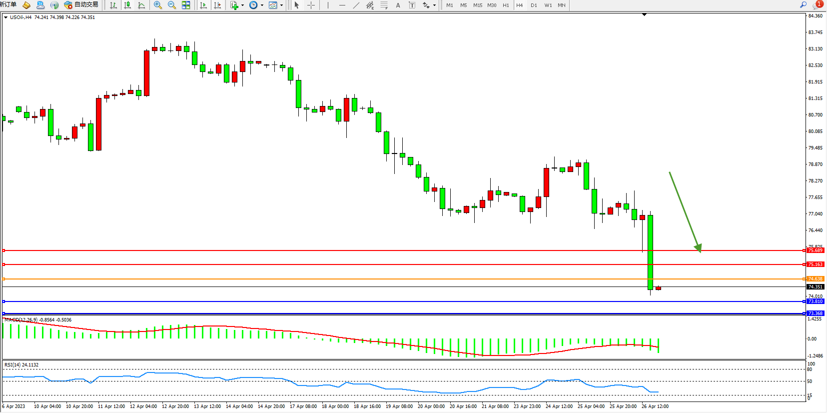 原油维持74.351附近震荡,美国至4月21日当周EIA原油库存 -505.4万桶,预期-148.6万桶,前值-458.1万桶。美国至4月21日当周EIA俄克拉荷马州库欣原油库存 31.9万桶,前值-108.8万桶。