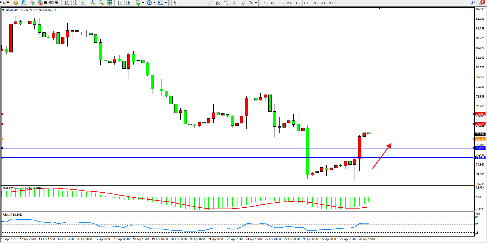 交易策略:76.346上方看涨,目标77.220 77.803