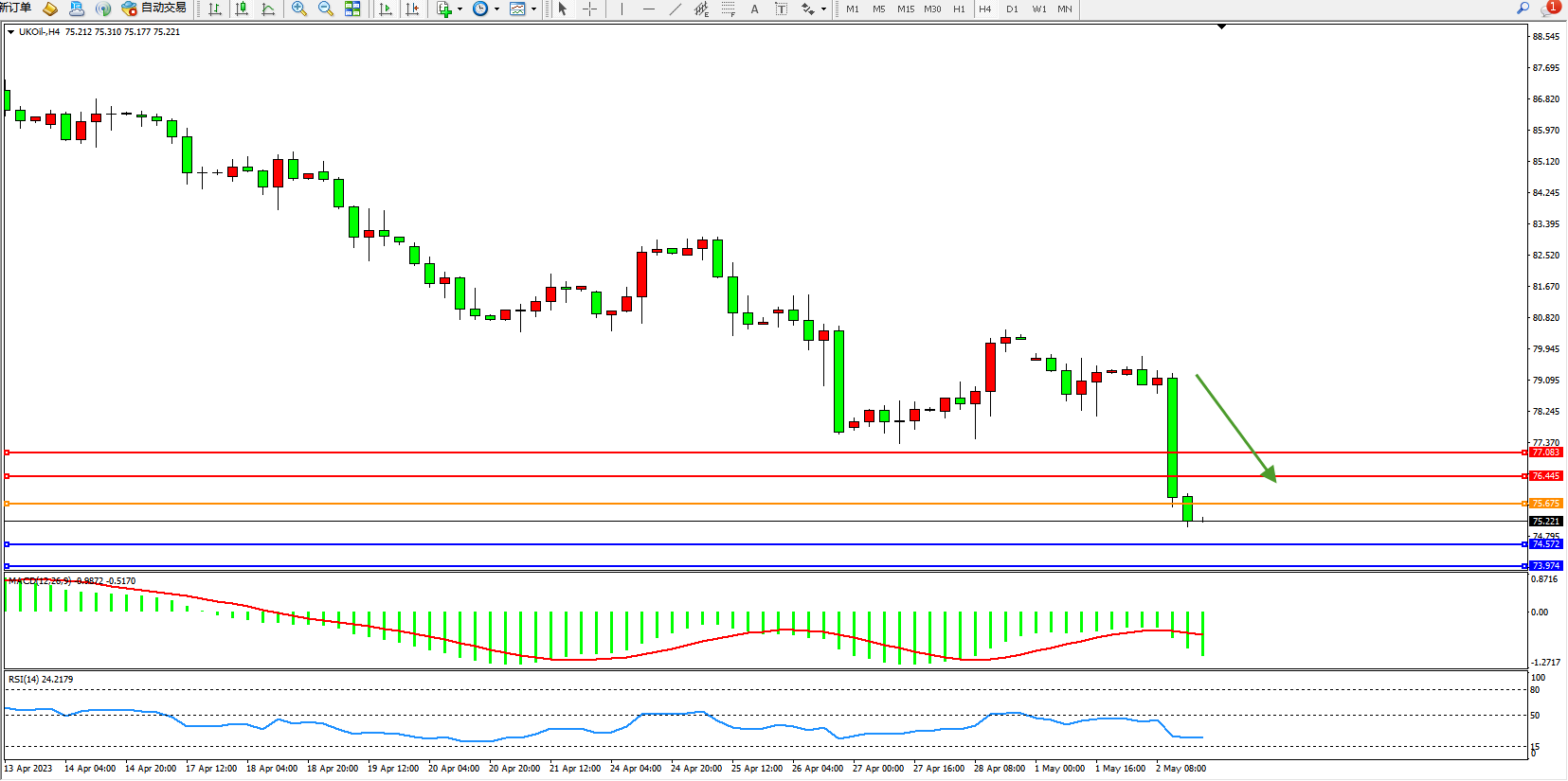 交易策略:75.675下方看跌,目标74.572 73.971