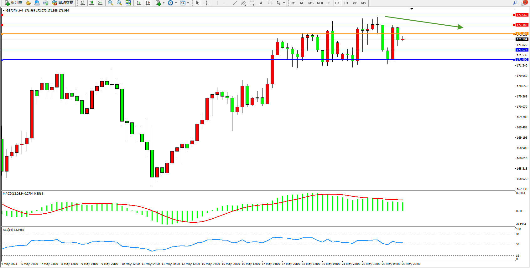 交易策略:172.134下方看跌,目标171.674 171.400