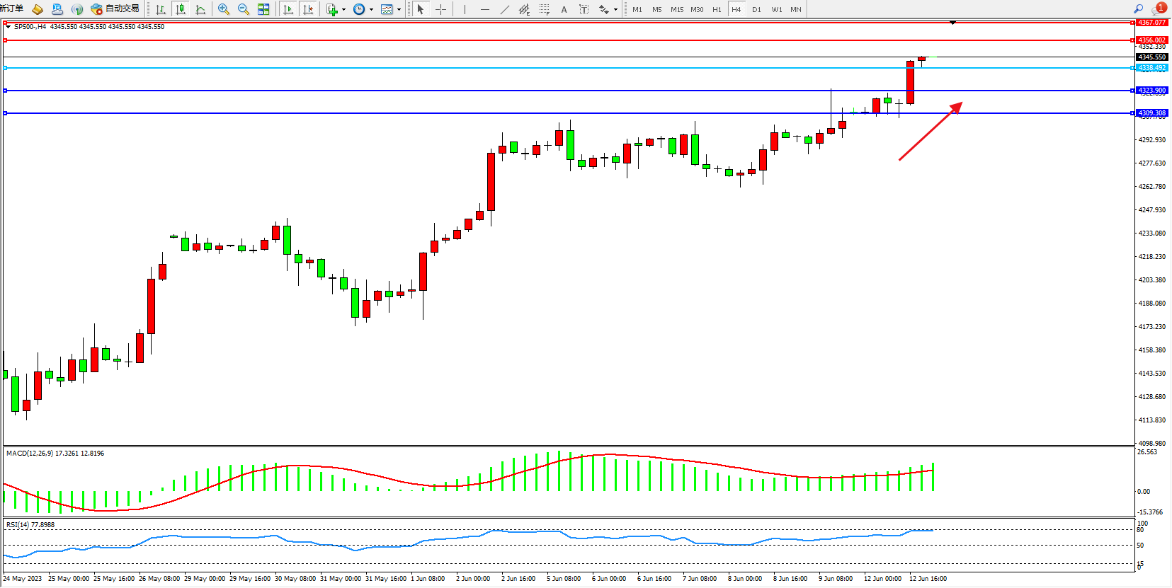 标普SP500——4小时K线图显示: