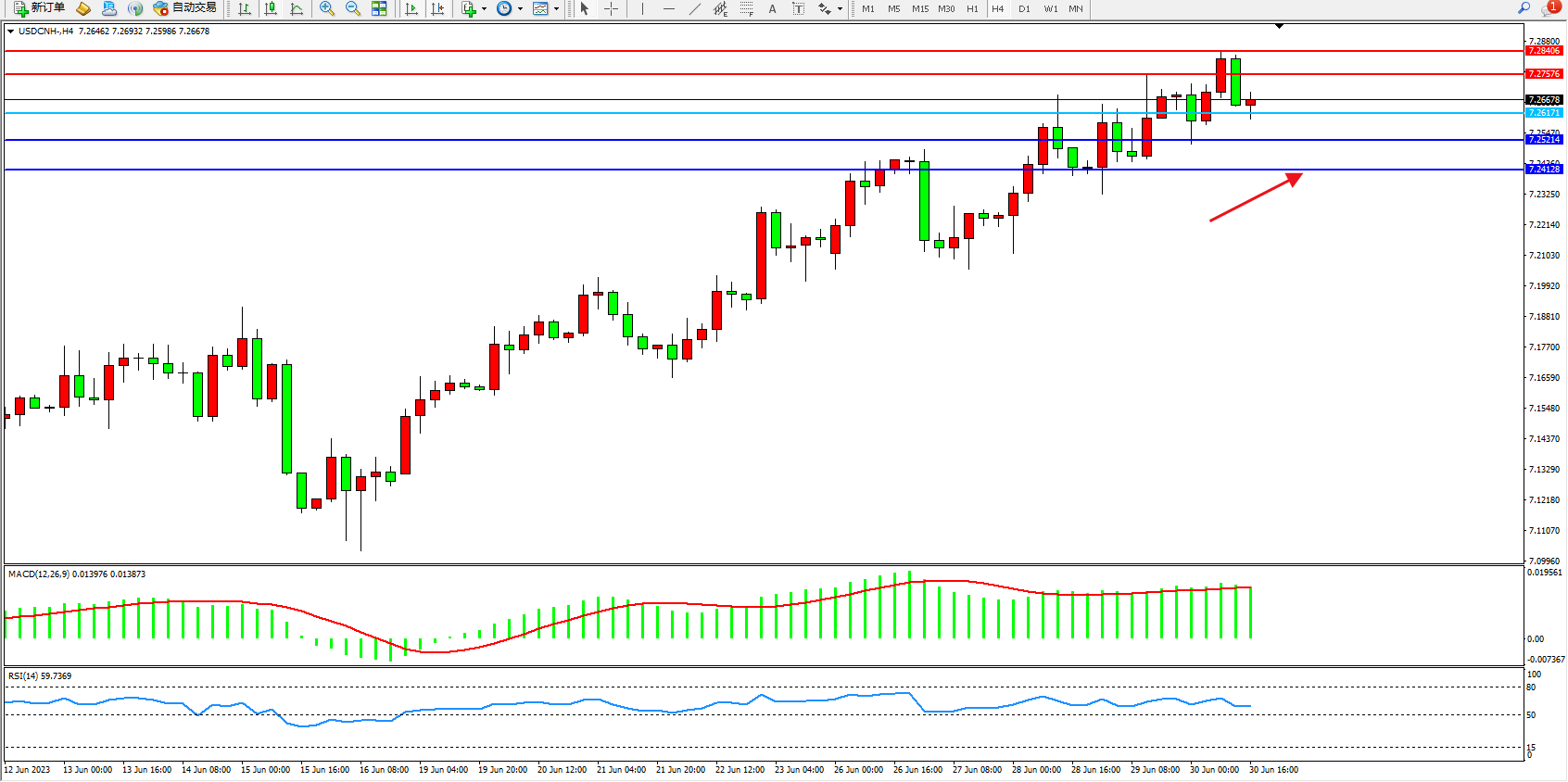 交易策略:7.26171上方看涨,目标7.27576 7.28406