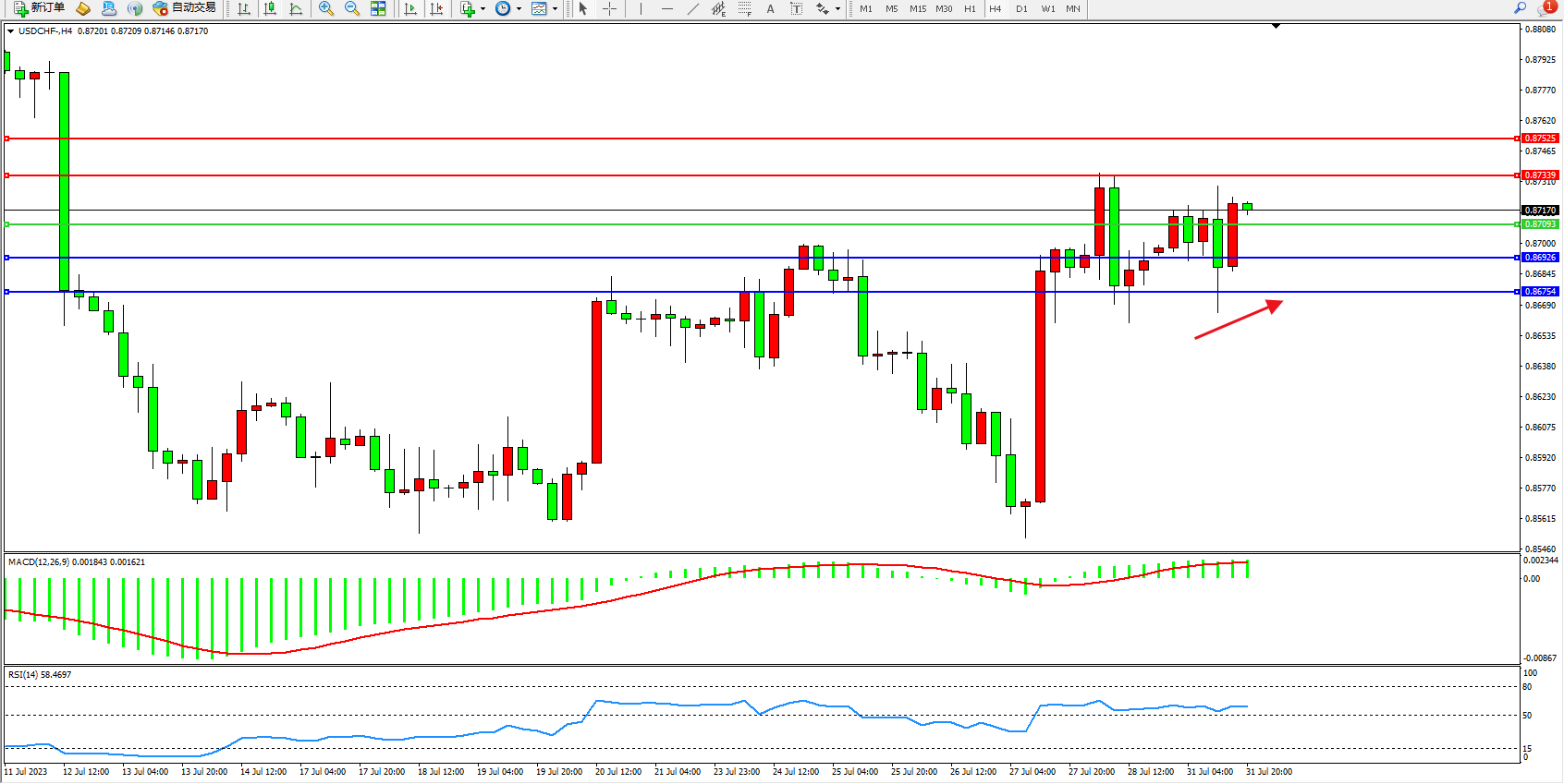 美元瑞郎USDCHF——4小时K线图显示: