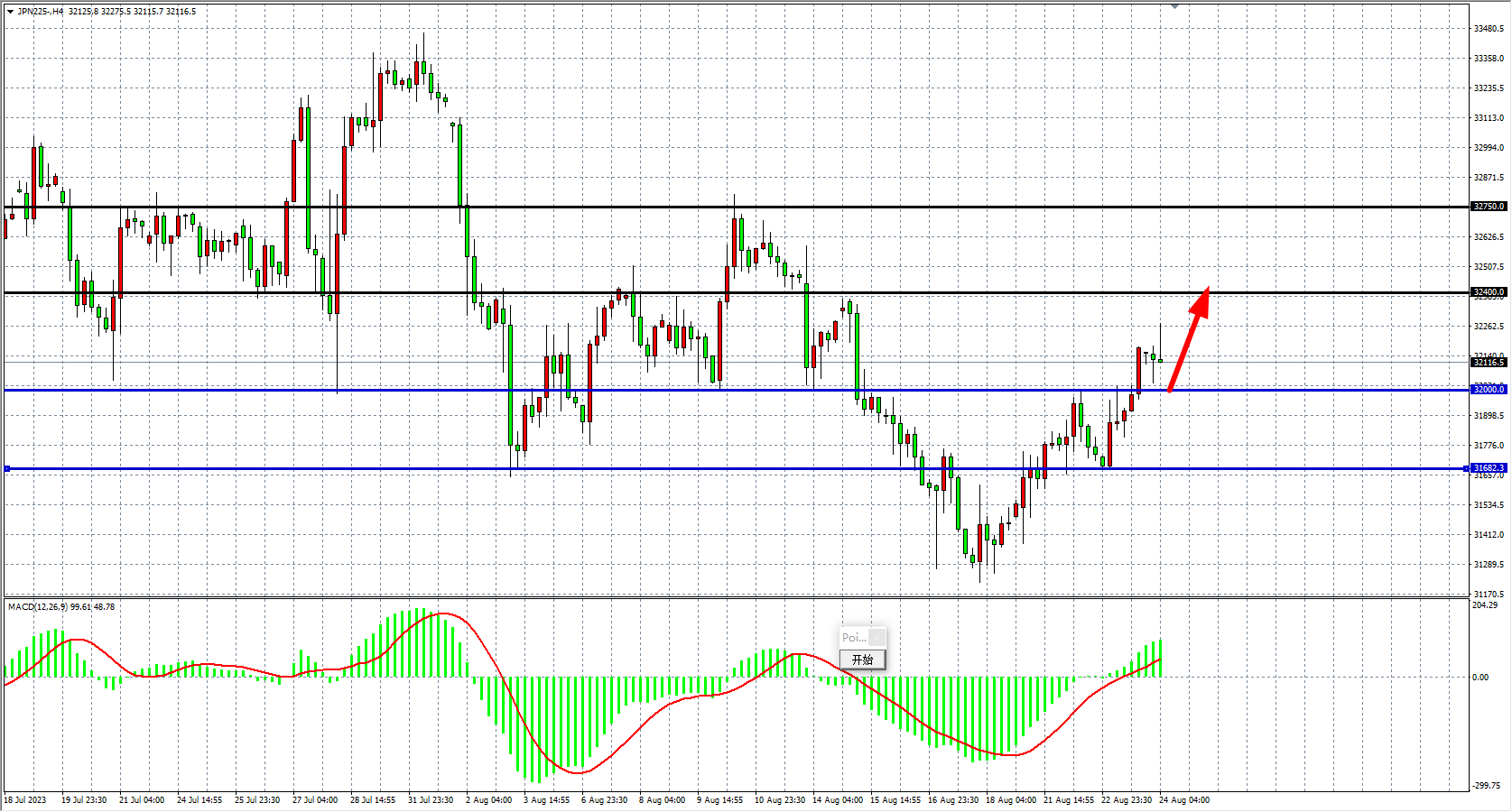 4小时图看,日经指数继续上行突破32000关口,MACD量能在零轴之上走强,多头趋势延续,支撑关注32000,阻力位关注32400-32750附近。