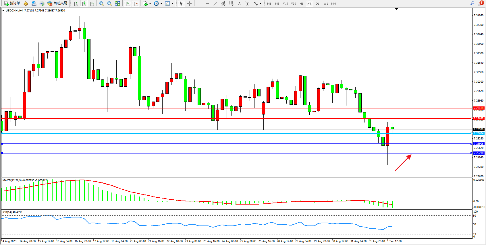 美元人民币USDCNH——4小时K线图显示: