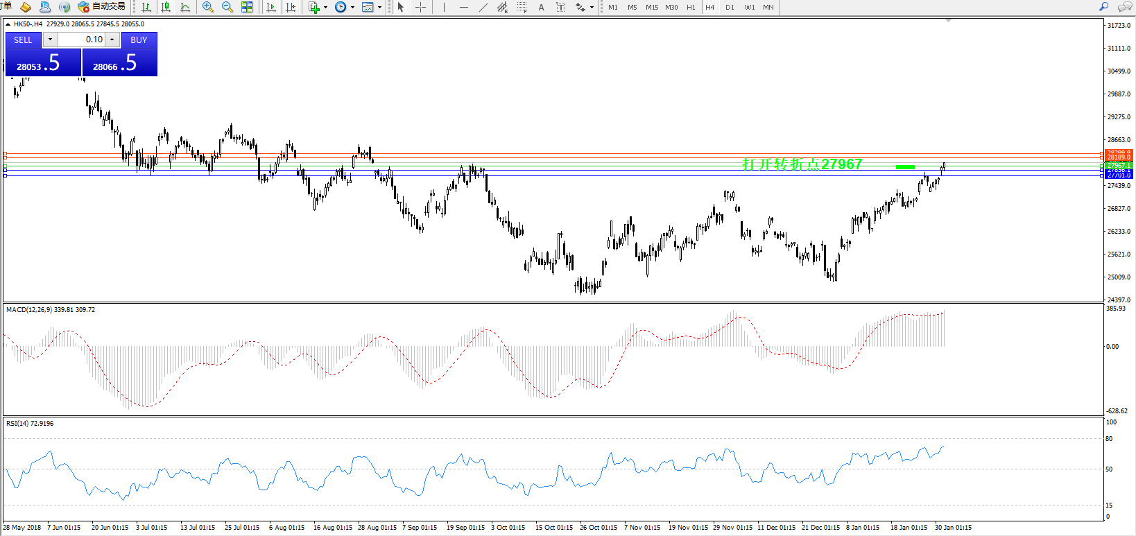 恒指HK50 ——4小时K线图显示: