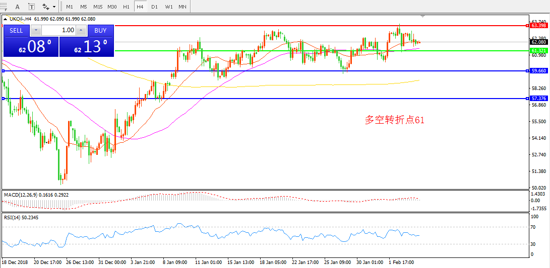4小时图看,油价强势突破63美金后回落,目前险守于55均线的附近, MACD红柱缩减,RSI拐头向下,短期内重点关注61一线支撑