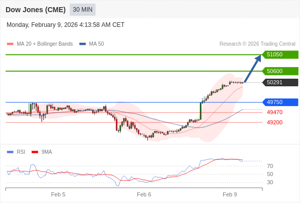 在 49750 之上,看涨,目标价位为 50600 ,然后为 51050 。