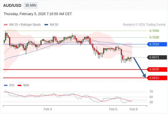 在 0.7010 之下,看跌,目标价位为 0.6935 ,然后为 0.6910 。