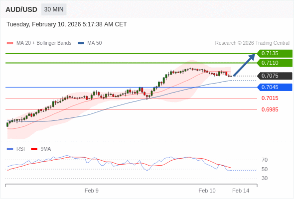 在 0.7045 之上,看涨,目标价位为 0.7110 ,然后为 0.7135 。