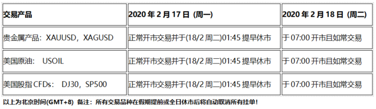 因应美国总统日假期(2020年2月17日,周一),以下交易产品的交易时间将受假期影响提早休市,敬请阁下留意知悉!