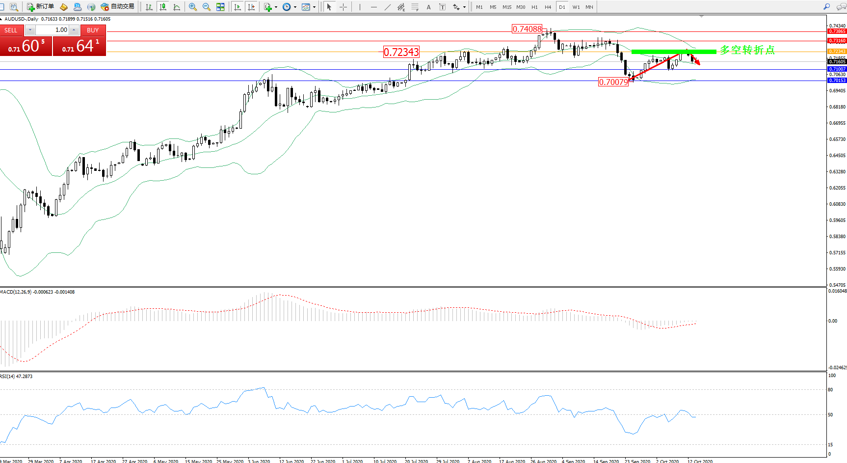 交易策略:0.72343下方看跌,目标0.71007、0.70153