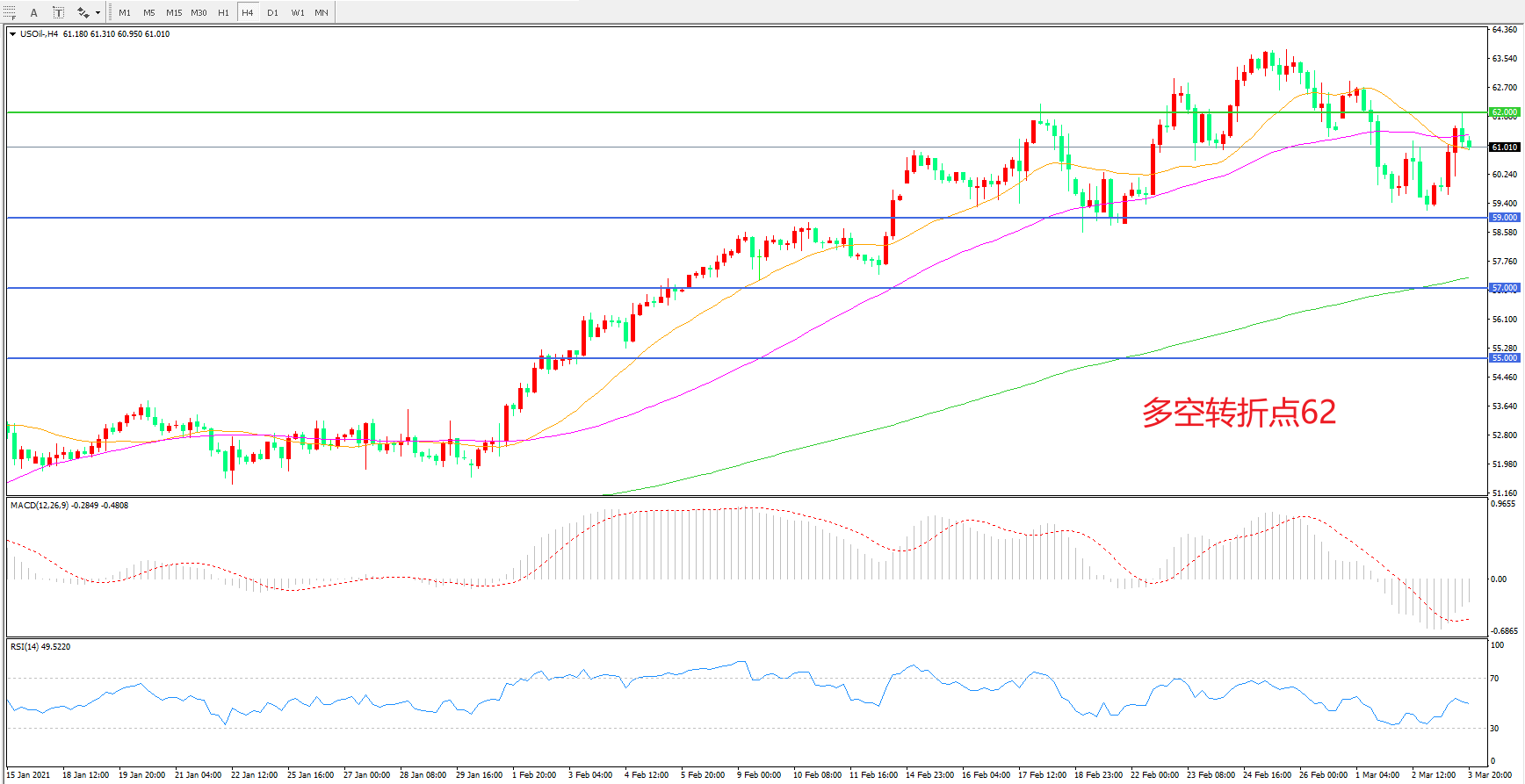 4小时图看,油价回踩59美元后再度反弹,短期走势有所回暖,但上方阻力并未被突破,形态上宽幅震荡迹象依然明显,MACD绿柱增加,RSI指标走平,日内延续震荡概率较大。
