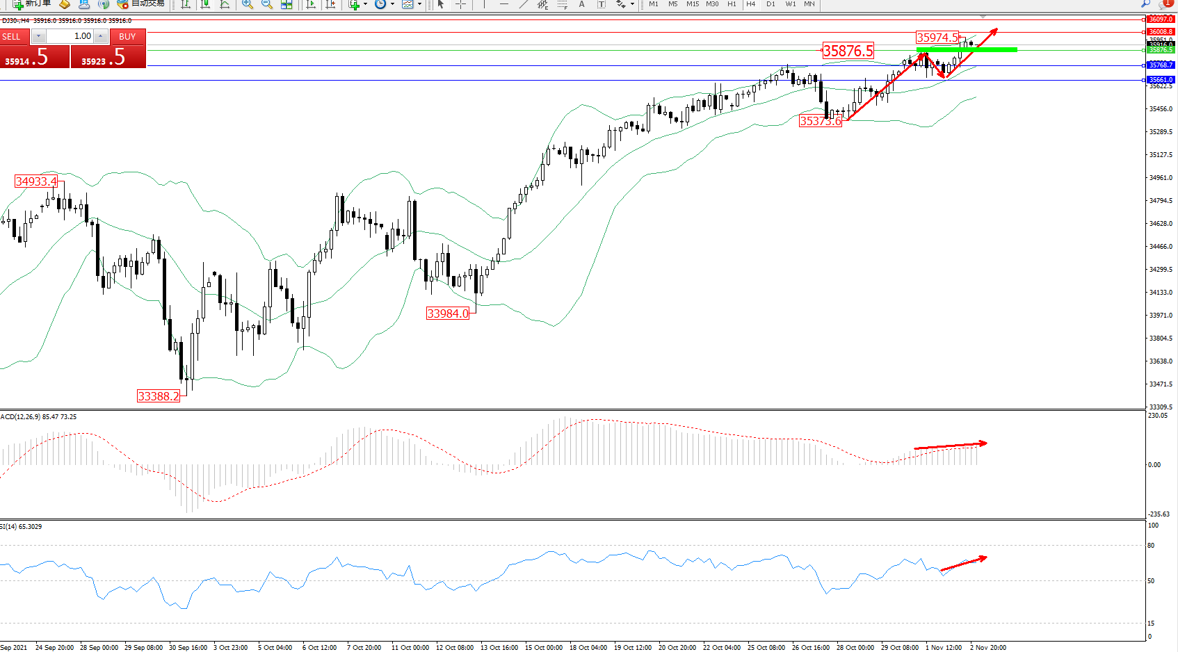 技术点评:多头动力延续布林带指标通道中上轨区间持续震荡上扬,高位抵达35974位置节点后开始短暂整理,多头动力有继续攀升态势,布林带指标呈收口走势持续向上移动中,MACD指标处于0轴线上方多头区域维持整理平移中;