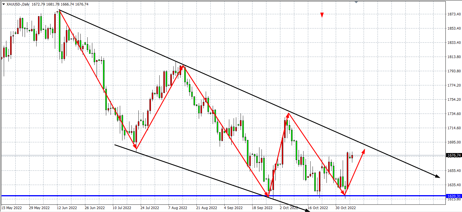 黄金于上周五(11月4日)非农数据公布后意外大涨,自低位1628美元大涨逾50美元至日内高位1682美元,涨幅3.12%,创下自2020年美联储无限量宽松以来的三大涨幅在美联储连续四次大幅升息75基点后,市场对美联储货币政策转向押注逐步升温,而在上周五非农数据中的失业率进一步攀升至3.7%更进一步支撑了市场这一预期。