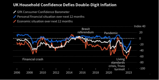 GFK公布的消费者信心指数 显示,5月,消费者信心上升3点至-27点,为2022年2月以来的最高水平。面对高达两位数的通胀,英国消费者信心连续4个月回升。报告显示,对经济前景的信心升至2021年底以来的最高水平。家庭对自己未来财务状况的满意度处于16个月高位。更多的人愿意进行大宗购买。