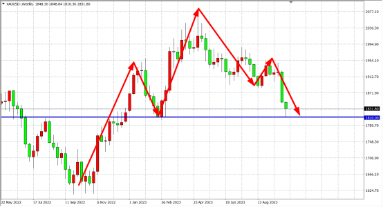 黄金周线,金价跌至前一波上涨的起点1810一线支撑,该位为中期重要支撑区域,在此有效反弹说明多头存在反攻动能,后市继续重点关注该位得失,在该位之上,行情有望反弹至1950-1980附近,若跌破该位则空头趋势重新走强,下方看1780-1750附近。