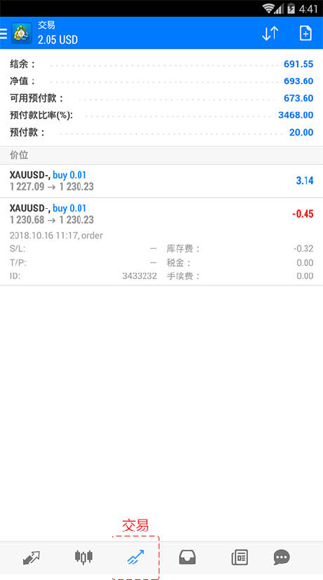 1.点击菜单栏的“交易”图标,将进入到交易页面。页面上方显示账户信息,下方显示未平仓的交易订单。